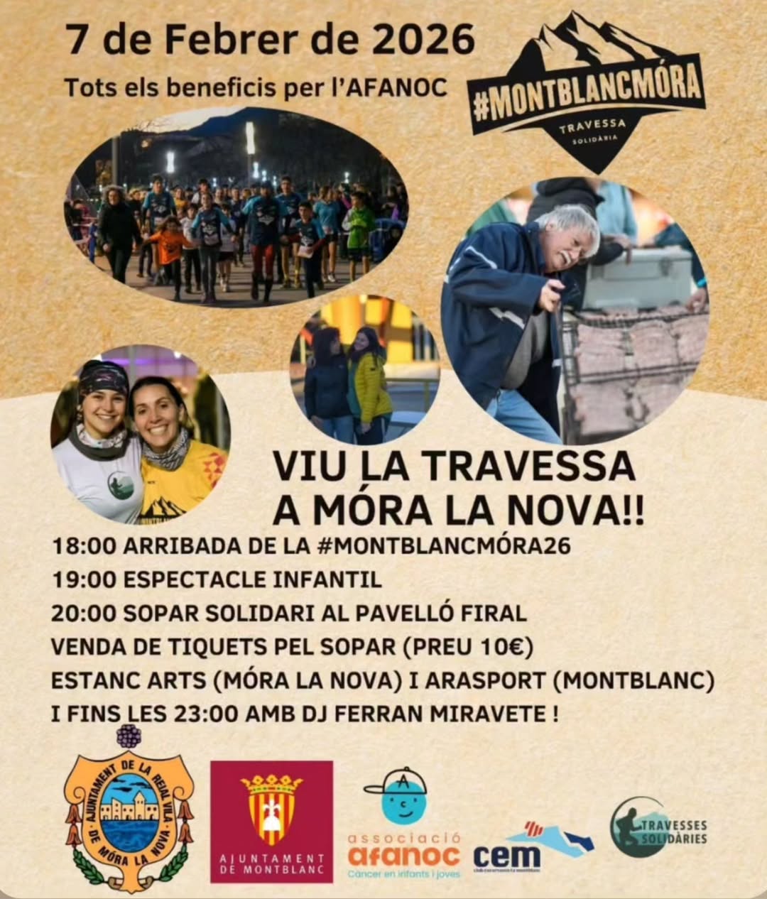 La Travessa Solidària MontblancMóra torna a celebrar-se aquest proper 7 de febrer. Un recorregut de 100 quilòmetres totalment soldiaris per recaptar diners per l’AFANOC. Un esdeveniment solidari adaptat per a tothom, que s’hi pot participar per trams i amb el sopar solidari que es fa a Móra la Nova! En parlem amb en Joan Roig, membre organitzador, i en Miguel Abella, regidor d’Esports de Móra la Nova.